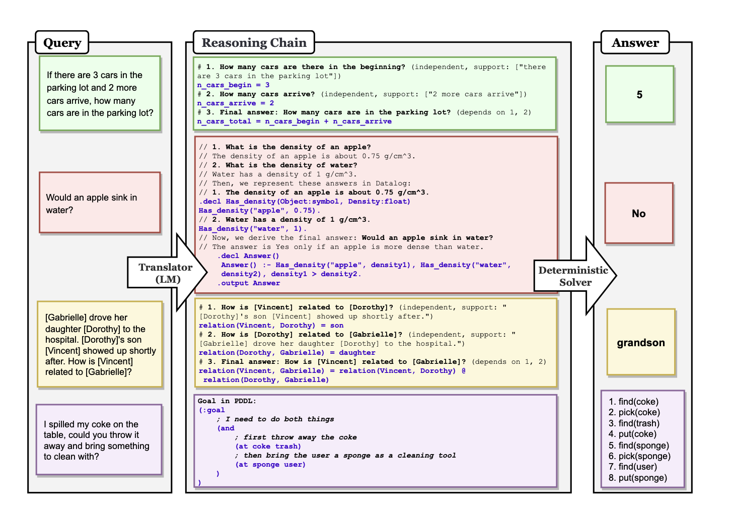- Translation : We first translate a user query into a series of reasoning steps. These are a task specific set of steps that we can execute deterministically.